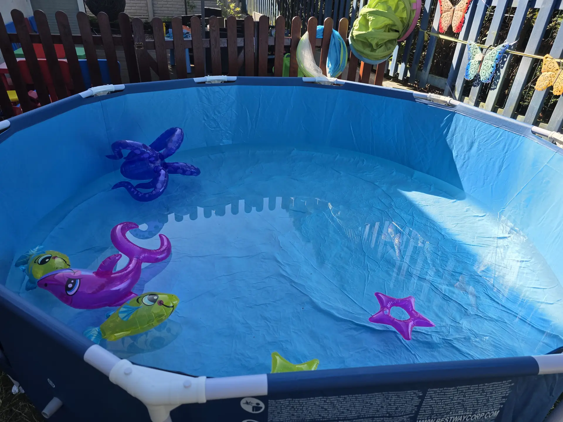 Dzisiejsza pogoda sprawiła, że nasz Czarodziejski Ogród zamienił się w prawdziwy mini aquapark, pełen wodnych atrakcji i śmiechu! Dzieci pluskały się w basenach z wodą, odkrywając wszystkie tajemnice „morskiego świata” – skakały, chlapały się i pływały na dużym, dmuchanym żółwiu, który unosił je po wodzie w basenie niczym po morskich falach.